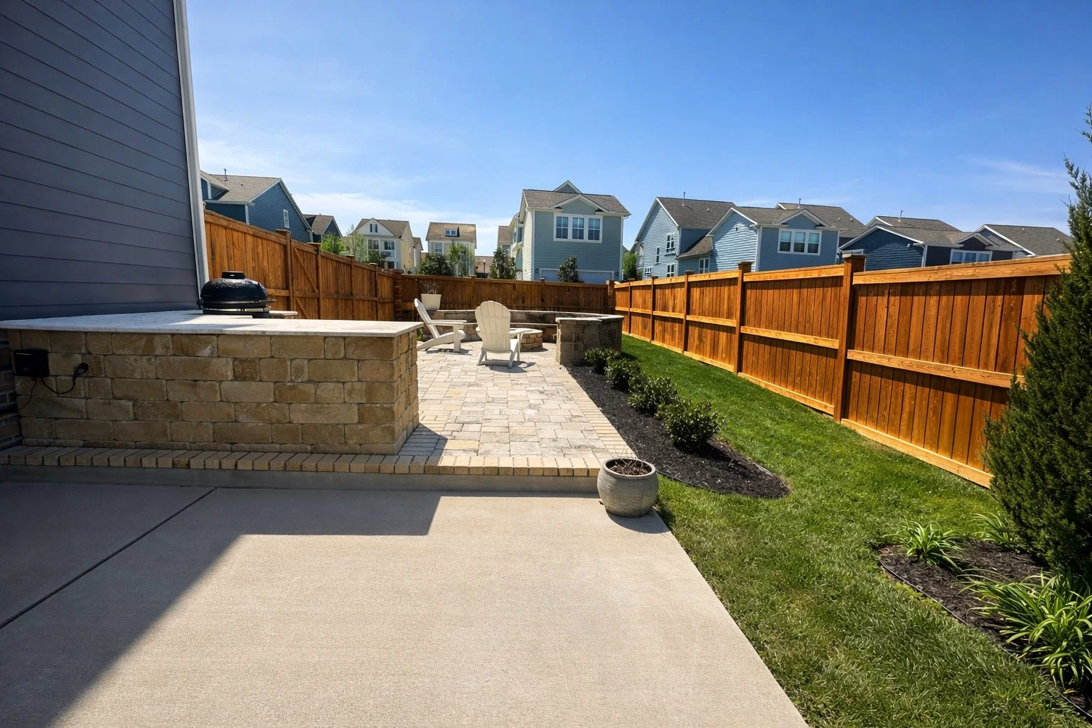 Open kitchen: dove-gray shaker cabinets, subtle-veined quartz counters, white subway tile backsplash. Stainless appliances, undermount sink with high-arc faucet, island seating three. Recessed LEDs, island pendants, under-cabinet lighting. Wide-plank vinyl flooring and neutral paint for a timeless, low-maintenance finish.