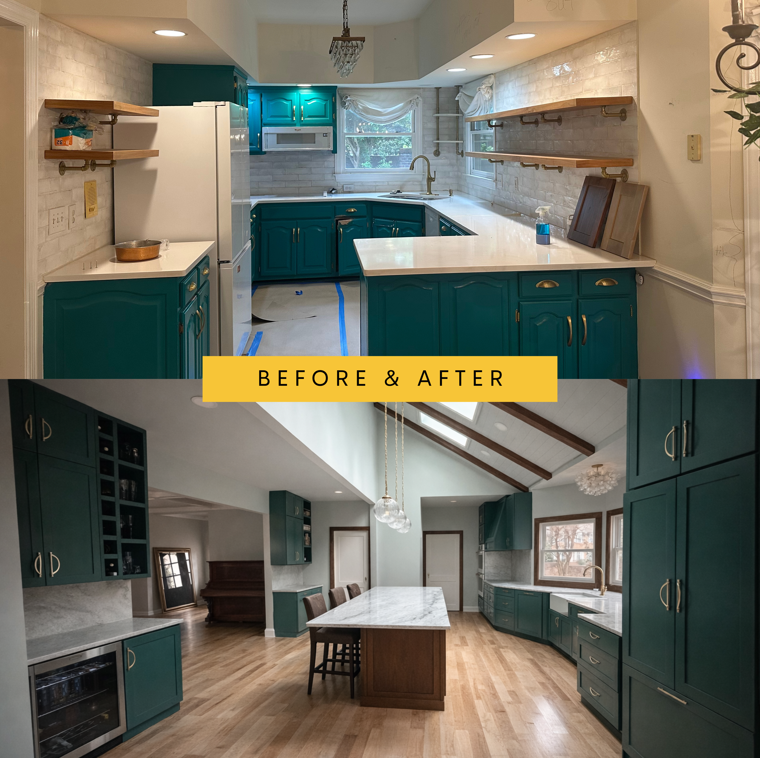 For this kitchen renovation, we transformed a cramped, dated layout into a bright, open, and highly functional heart of the home. We reconfigured the space to improve flow, added skylights to flood the room with natural light, and installed custom cabinetry for dramatically increased storage. The cabinets were refinished in a rich, modern green to bring warmth and character, while new countertops and backsplash elevated the look with durable, low-maintenance surfaces. We built a large custom island for gathering, prep, and everyday living, added a dedicated desk nook for working at home, and created a built-in wine and beverage station complete with a mini fridge. Upgraded lighting, new hardwood floors, and architectural ceiling details finished the space, resulting in a timeless, inviting kitchen designed for both daily life and entertaining.